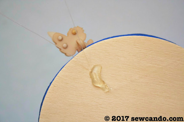 Lastly, cut a piece of filament thread, made a loop and put a dab of glue over the ends on the back of the ornaments.
