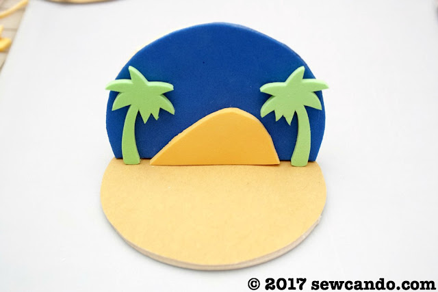 Now for the decorating! To do the Three Kings theme, use some foam cut stickers (or sheets of craft foam to hand-cut or use a cutting machine). We used some palm trees as-is and trimmed down a dinosaur to make a sand dune: