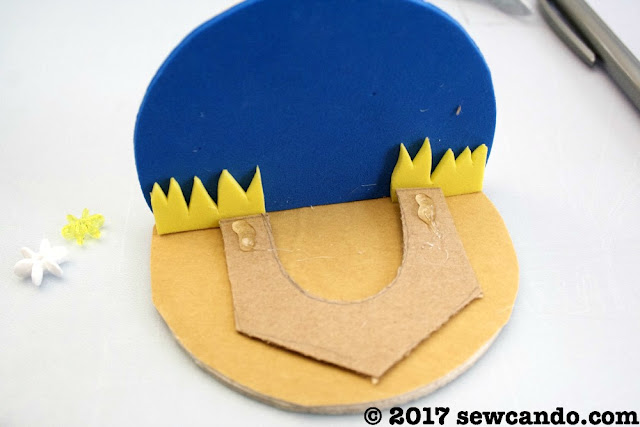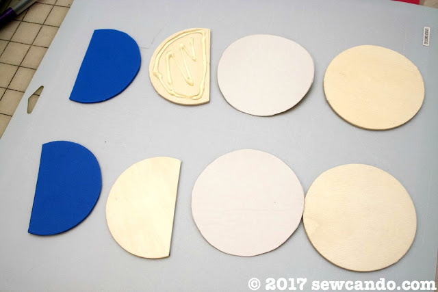 Cut 3 of the wood circles to make a straight end (about 1/3 off a circle). Trace that shape onto the paper or foam that will be the background. Then hot glue the colored pieces onto the wood: