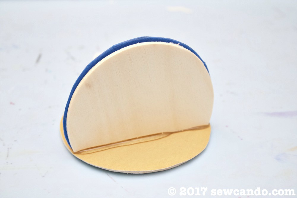 Run a line of hot glue under the flat end of the cut wood and attach it to the base circle like this:
