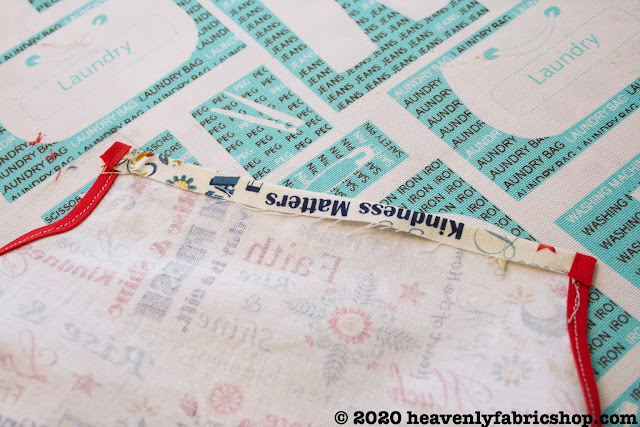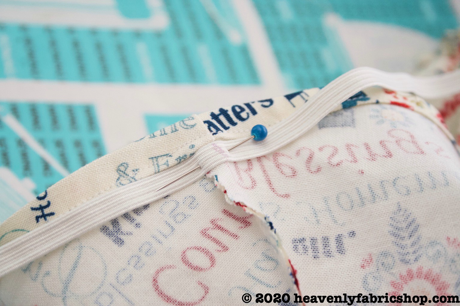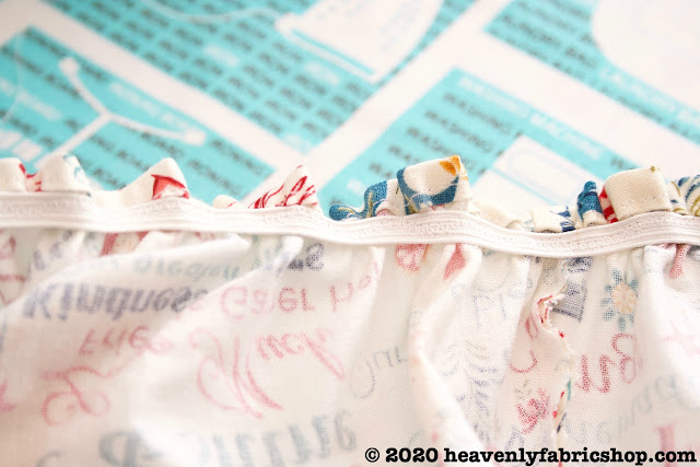 With a safety pin, snake the elastic/ribbon through the front and back casings. Overlap the elastic ends about an inch and zig zag stitch together. Pull the elastic so the stitched ends get hidden inside a casing and the gathering is evenly done on both sides.