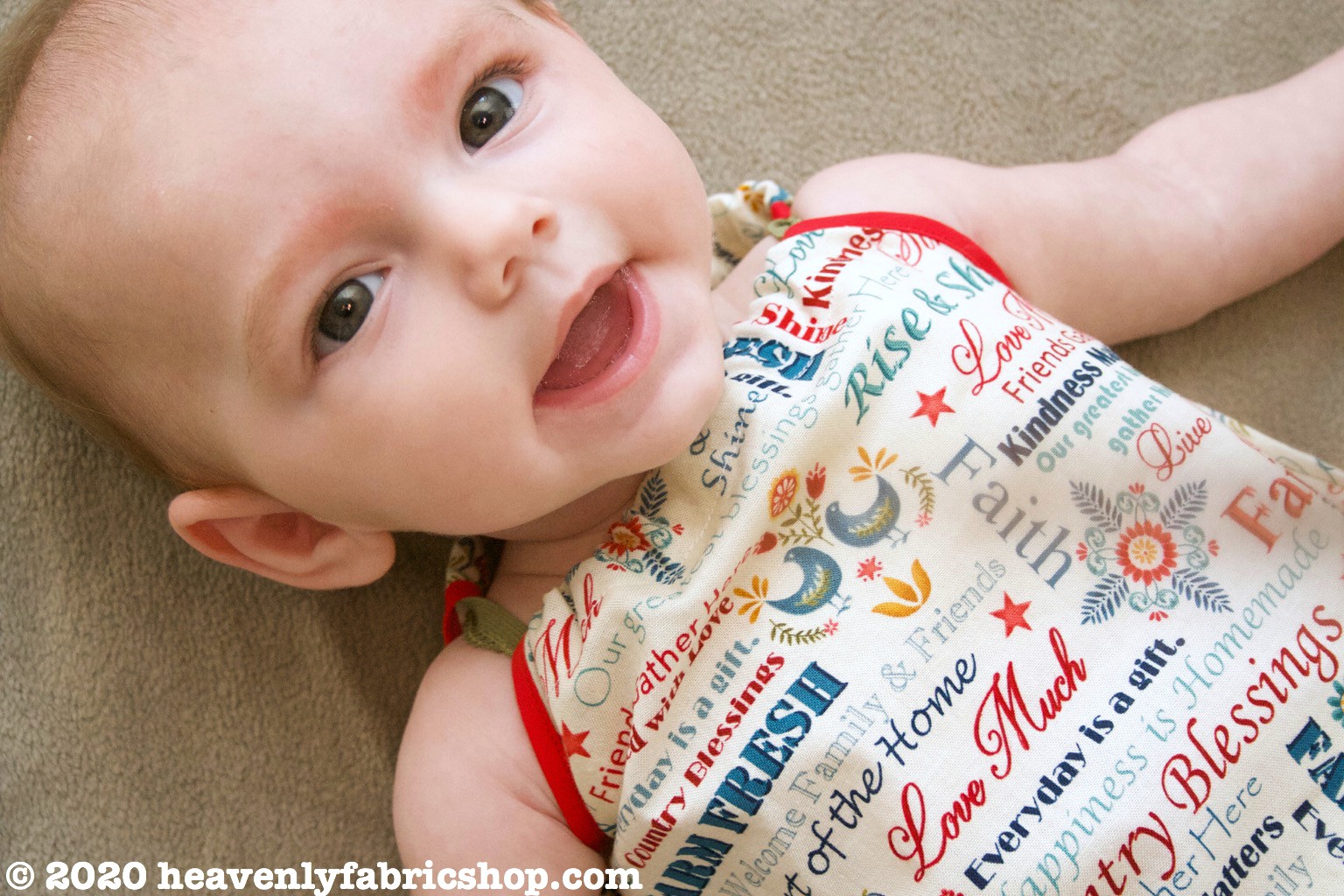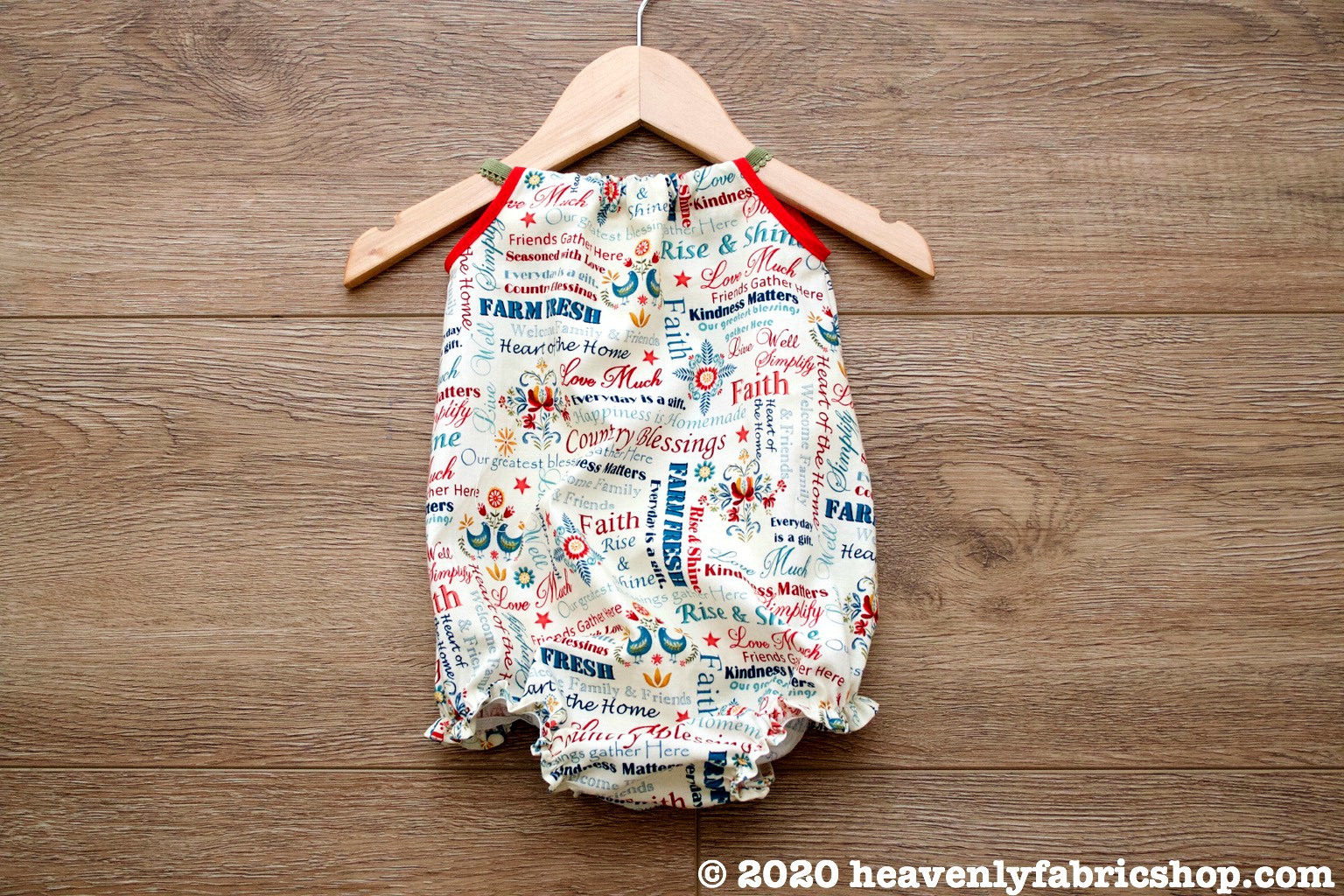 Make a sweet and comfy bubble romper to keep baby cool this summer. This easy sew design is ideal with favorite cotton prints. We made this one patriotic for the Fourth of July with our Count Your Blessings Cream fabric.