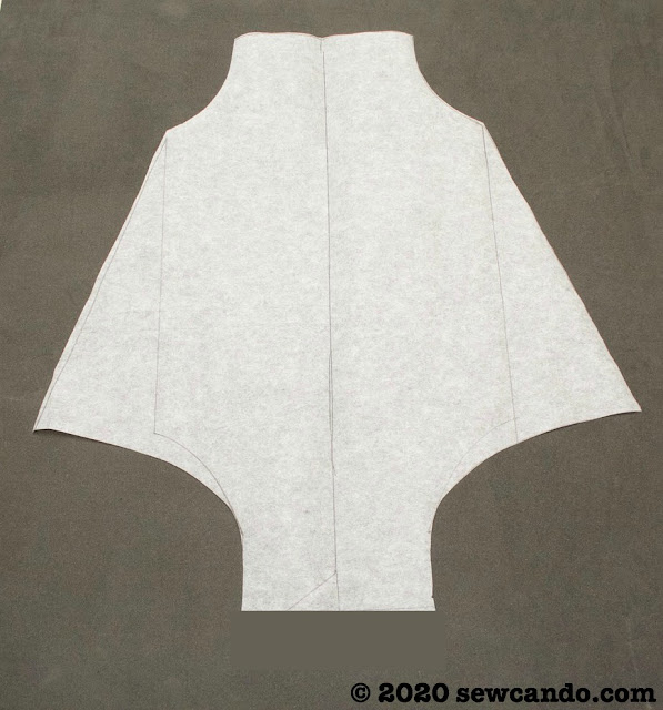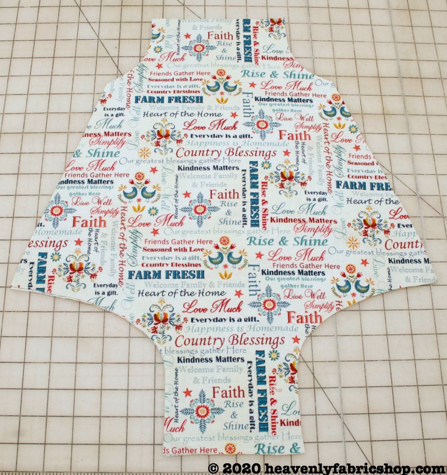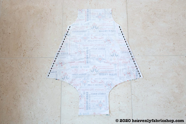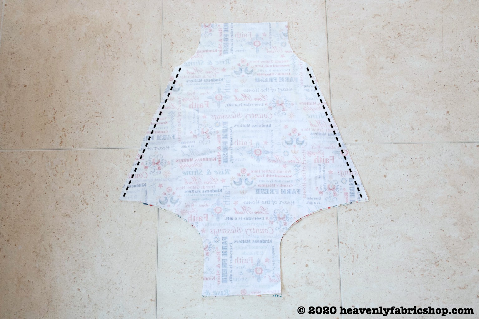 If using a self-drafted version, where the pattern is full width, have fabric folded in half, with selvages on one side. Cut out two pieces from the fabric (front & back).
