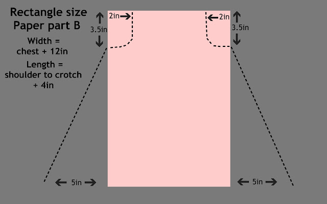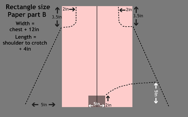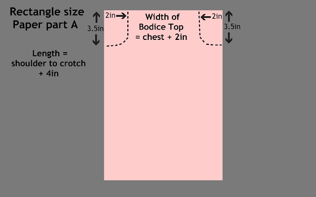 Take paper and measure out a rectangle that is the bodice width and romper height. This is paper part A. You'll need a second piece that is at least 10 inches wider than the bodice width for extending the sides to make the bubble shape.
