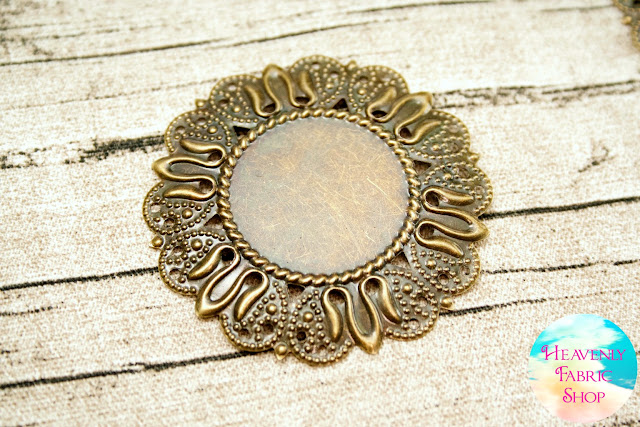 Another setting option is to use a decorative metal medallion. These are lightweight, but add some extra flair to the center design. Just glue the cab to the medallion and then glue that to whatever you want to decorate. We carry this particular style in silver & antique bronze to fit our selection of 25mm rounds, but there many sizes, metal finishes and medallion designs out there to suit whatever cabochons you're using.