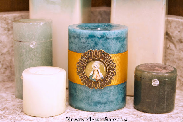 Candles: Use a cabochon & medallion with grosgrain ribbon to wrap a candle for instant decorative swag: