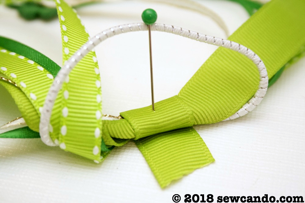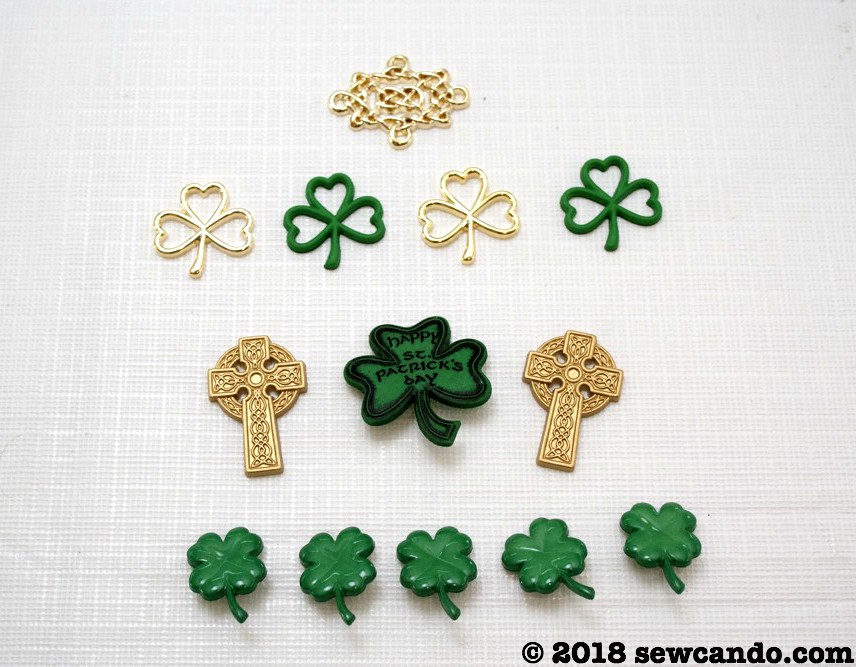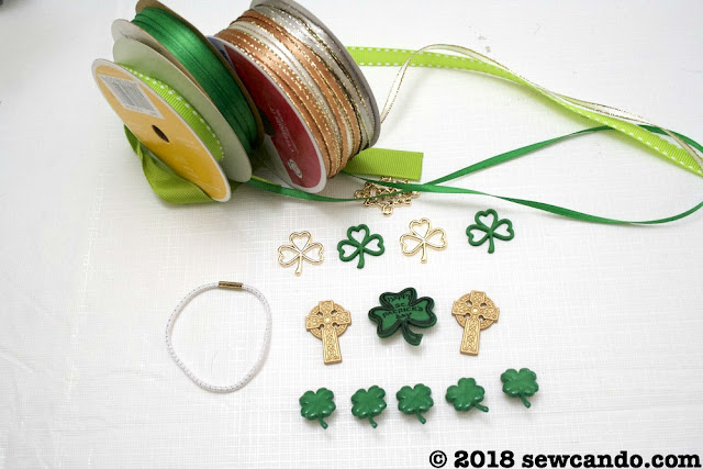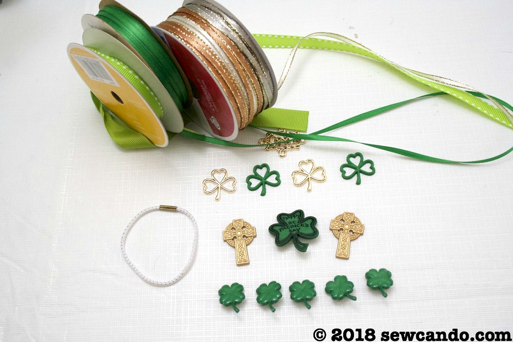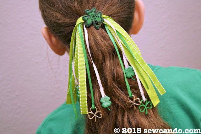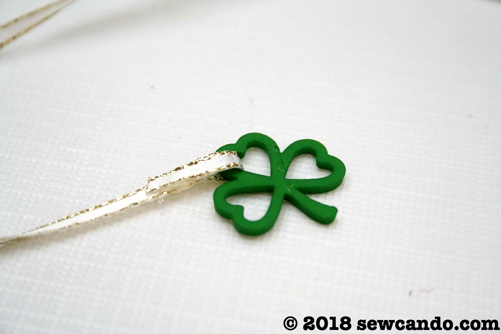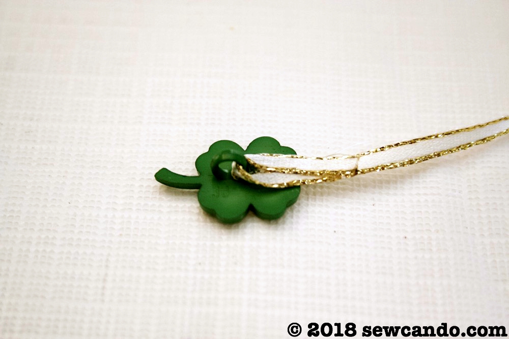 Run the cut edges under a lighter to heat seal them to prevent fraying. We used the open shamrock charms with the thinnest ribbon and looped the ends around them and then put a dab of hot glue to hold them: