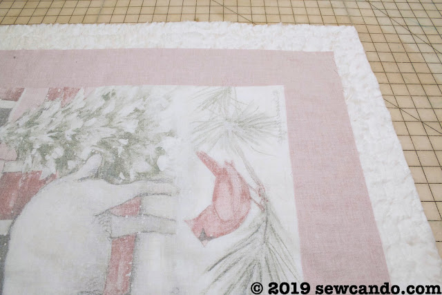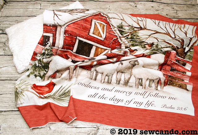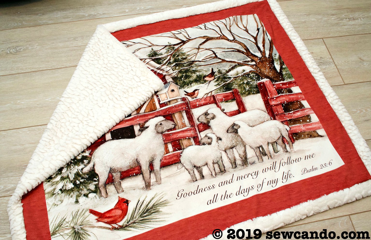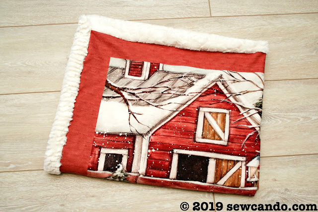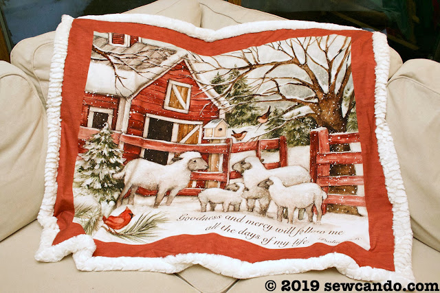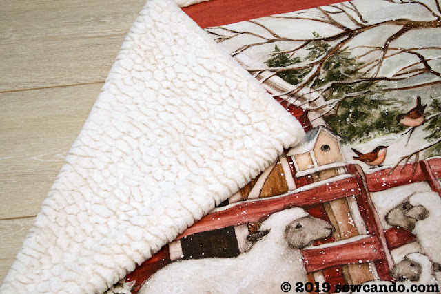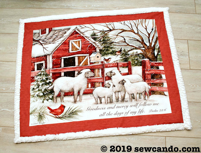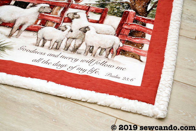 This blanket design uses a marshmallow-y soft sherpa fabric that wraps around to the front to add a fluffy border around the panel. It's the perfect fabric to go with my sheep print fabric panel and really pop against its rustic reds.