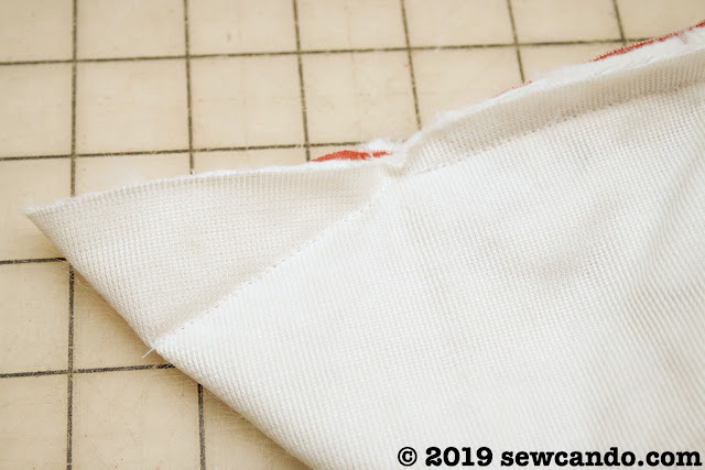 Pull the open corners to a point and stitch a diagonal line to make nice mitered corners. Trim off the excess fabric. Turn right side out and hand stitch the gap closed.
