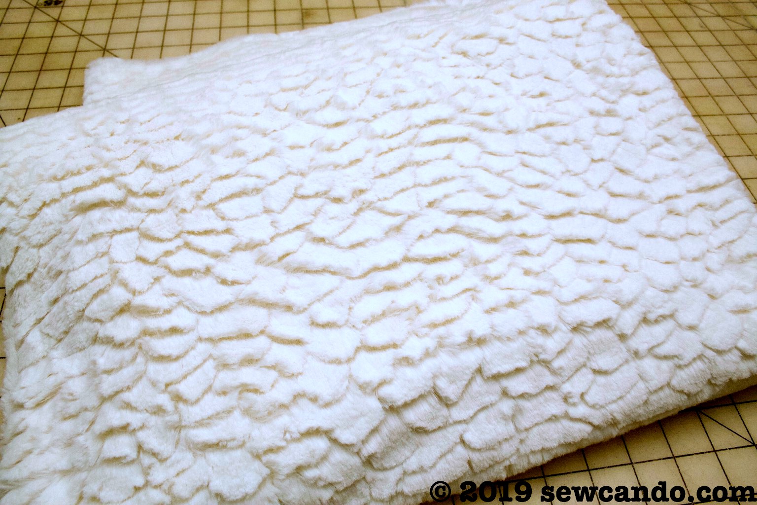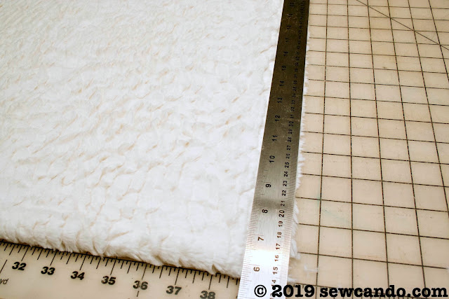 Start by folding the panel in half and trimming the edges to be perfectly even using a yard stick (it should be 34 inches high by 42 inches wide). Fold the sherpa/cuddle in half widthwise and cut to be 39 inches high inches by 48 inches wide. This kind of fabric sheds quite a bit so have a vacuum ready after cutting.
