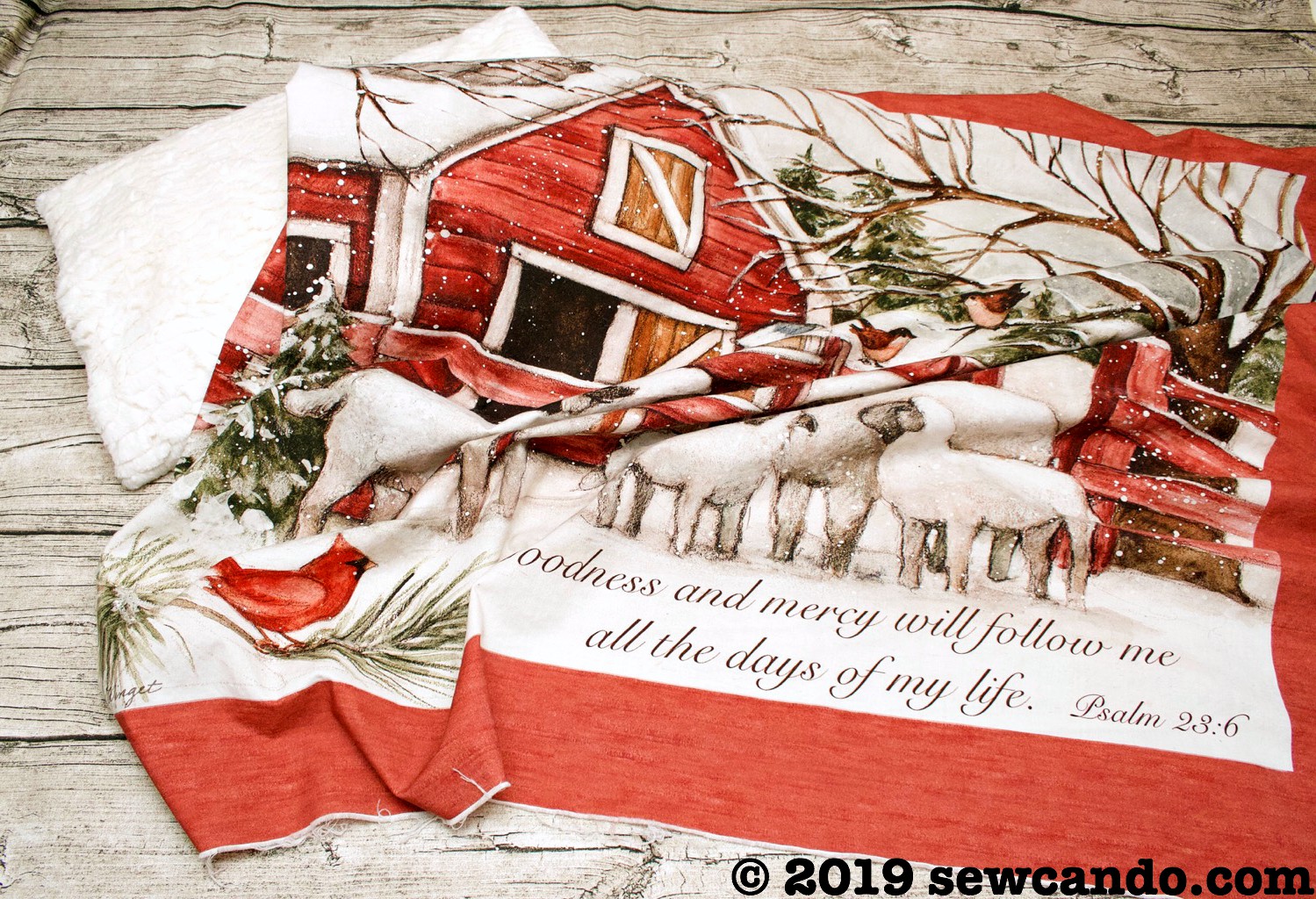 Our classic The Lord Is My Shepherd Winter Sheep fabric panel is just perfect to pair with a plush fabric. The fluffy texture framing the panel design adds a luxurious feel too: