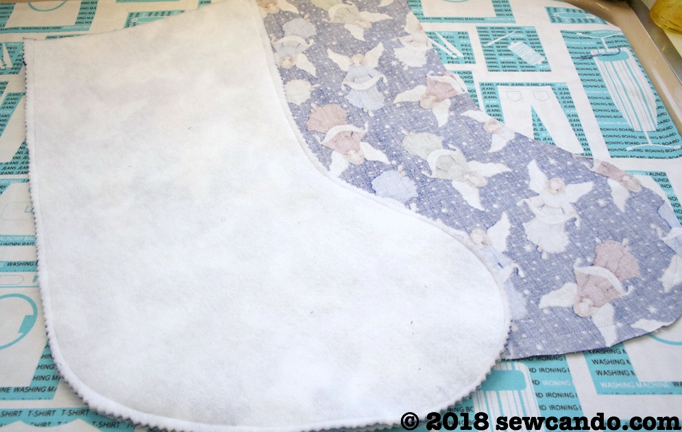 With raw edges of cuff and stocking facing, match up side seams and pin through all layers. Stitch together.