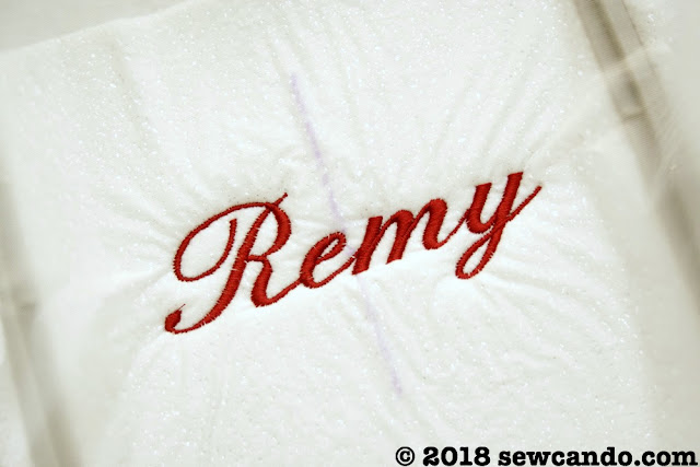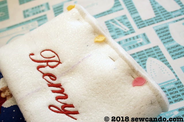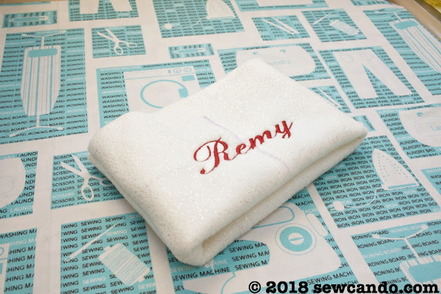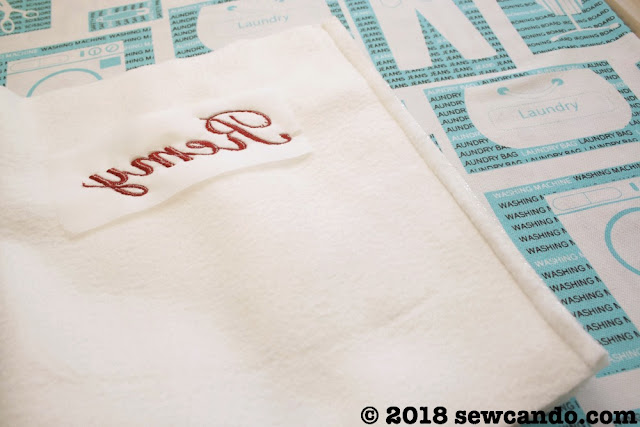 Mark center based on size of lettering and embroider the name on. Peel away the top stabilizer and cut the excess away from the back. Hand embroidery or heat transfer are other options for personalizing.