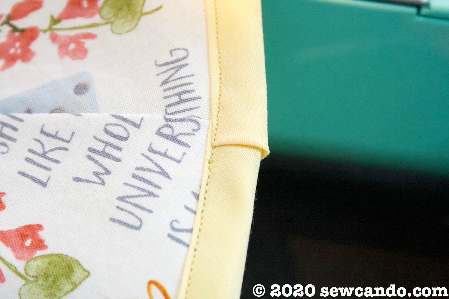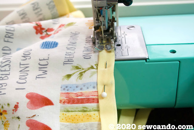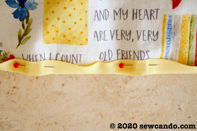 If you don't have bias tape, you could always fold the raw edges inward 1/4 inch, press and then top stitch the layers together, but the contrast of of tape adds a nice detail and makes it very fast to sew:
