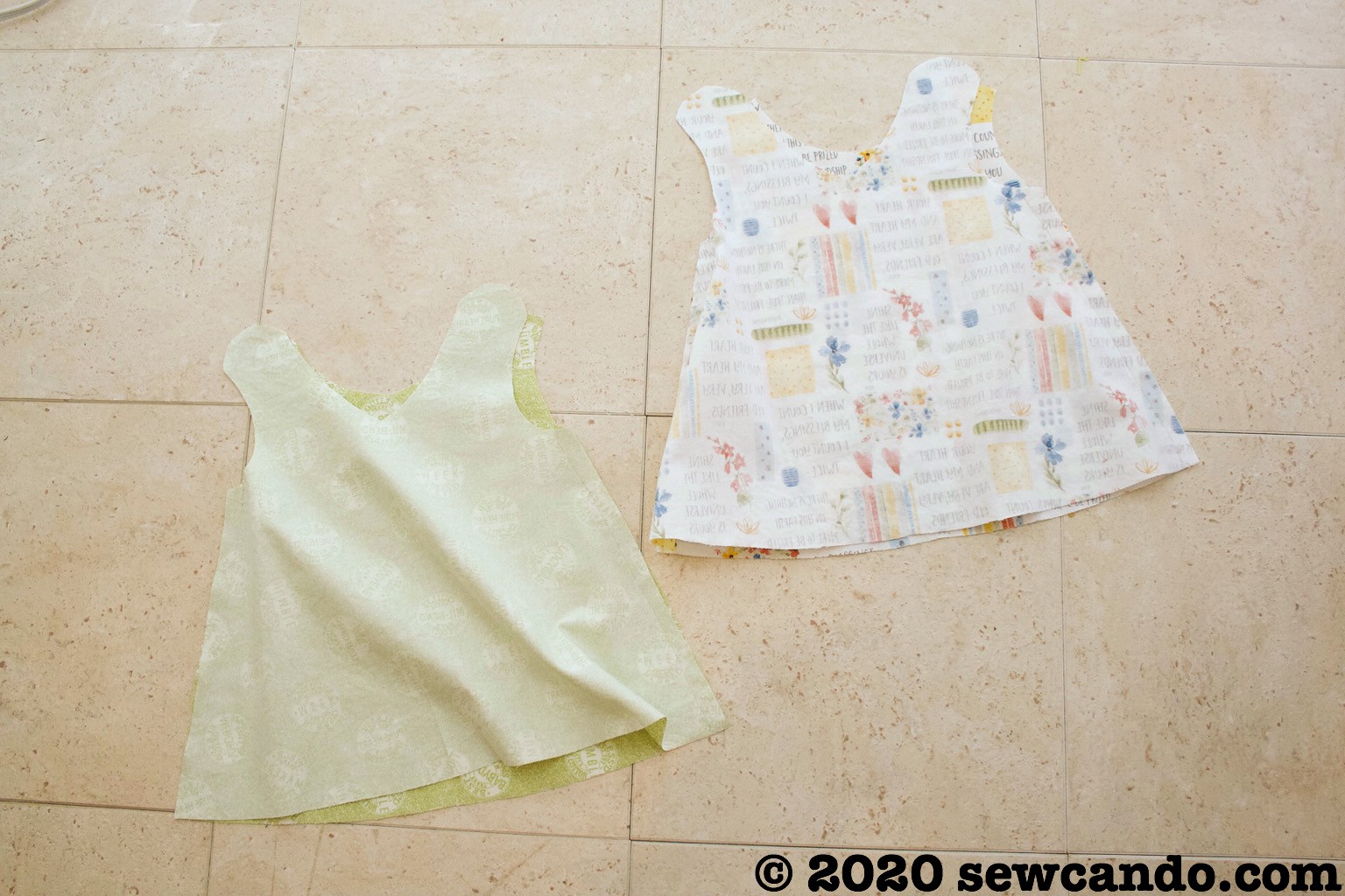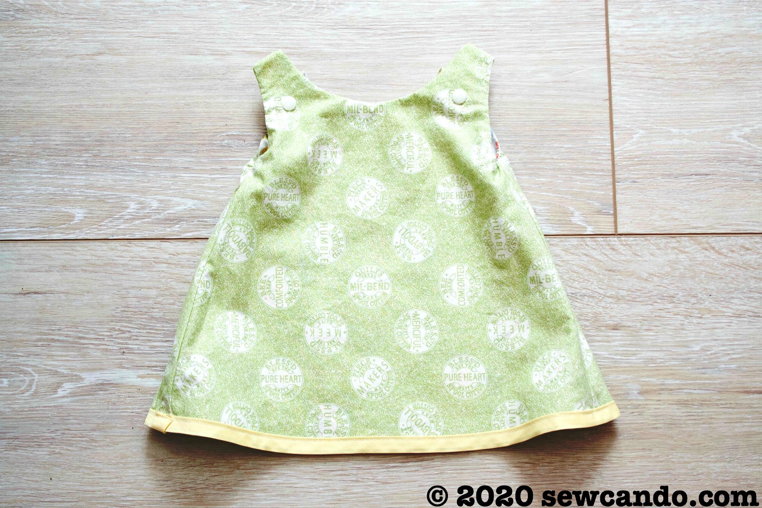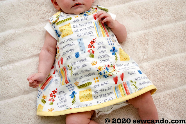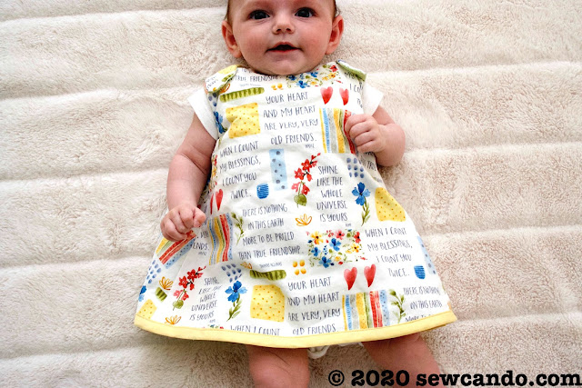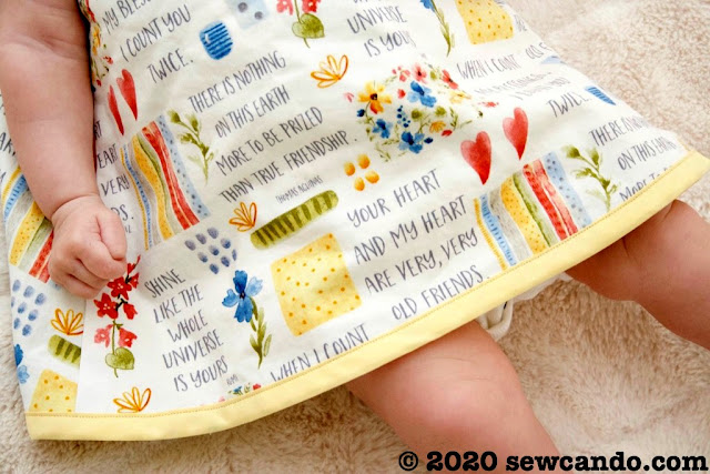 This fully lined/reversible dress is an easy sew and super versatile. We're providing sizes for 0-6 and 6-18 months as dresses, but the larger size could also be worn as a tunic top for up to 2T.