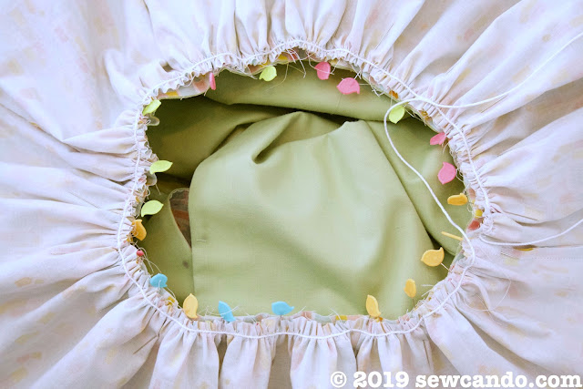 Insert bodice, right side out, into the skirt, matching up the raw edges at center markings and side seams. Adjust gathering as needed and pin.