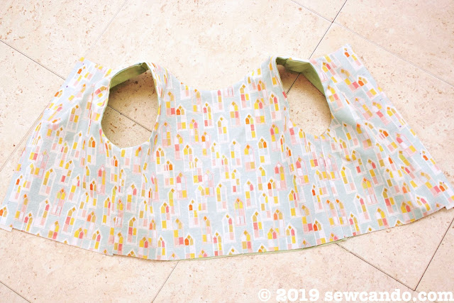 Turn the front bodice piece right side out and press around the seam to get them nice and flat. Insert the shoulder sections into each of the shoulder sections of the back bodice pieces, matching up the fabrics and seams.
