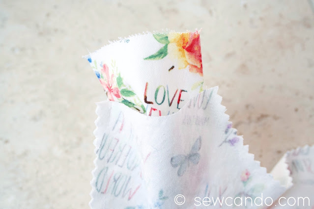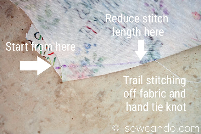 Starting from the arm area, stitch towards the point, reducing the stitch length to .75 about a quarter inch from the end and in that last quarter inch, stitching as close to the fold as possible, trailing off the fabric a few stitches. Leave a thread tail before cutting so there's enough to hand tie the knot. Repeat on other side of bodice.