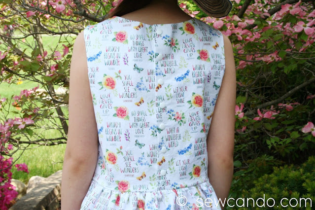 Try on to determine desired length of hem and finish as desired. We preferred double folding the hem up 1 in (for 2 inches total) and then topstitching. We made this dress mid-calf length, but you could trim a few inches if that's too long - totally up to you. Set the snaps along markings and enjoy your pretty new dress!
