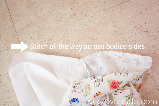 Now, take the open sides and match up the raw edges and sew across from the outer to the lining on each side of the bodice. Trim seam allowance. Turn right side out and press layers flat. If doing button closure, do button holes now.