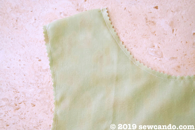 With right sides facing, pin together the front bodice outer and lining around the neckline and the arm scythe. Stitch together using a 3/8 inch seam allowance. Do the same on the back bodice pieces, also stitching down the straight center sides.