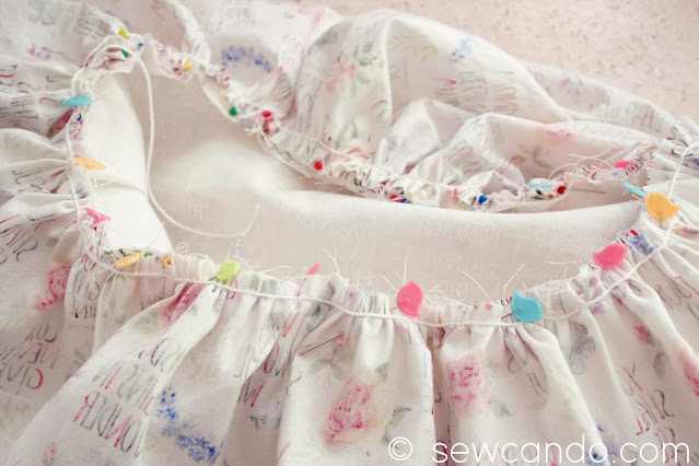 Pull up the string ends and spread gathers evenly. Insert bodice, right side out, into the skirt, matching up the raw edges at center markings and side seams. Adjust gathering as needed and pin. Stitch together with a 1/2 inch seam allowance. Serge or zig-zag over the raw edges.