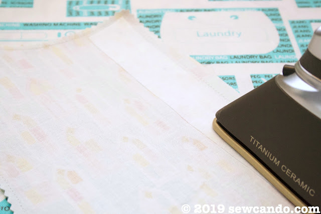 Cut two pieces of fusible stabilizer that are 1 inch wide by 12 inches long and fuse to the wrong side of the back pieces, just next to the newly sewn straight side seams. This will be to stabilize where the snaps/buttons will be.