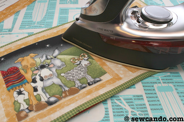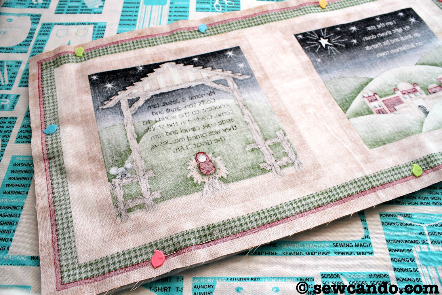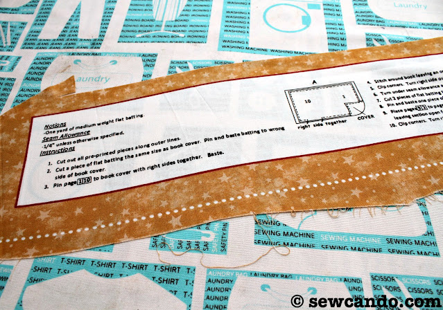 Basically, you just follow the cut lines, pair the proper pages together (right sides facing), put on a layer of batting, pin and stitch around, leaving a couple inch wide gap.