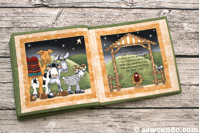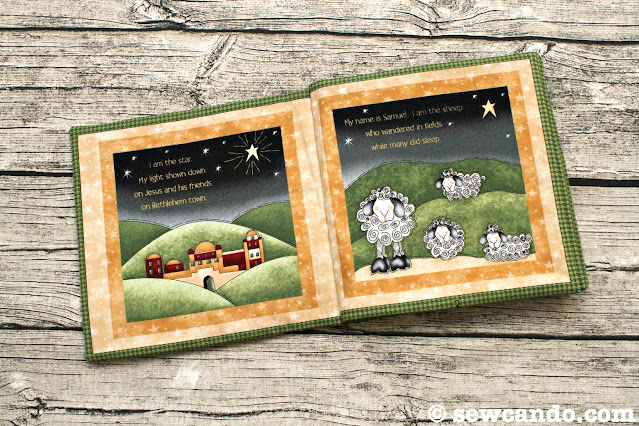 It is our youngest baby's first Christmas and she LOVES anything crinkly, so we added some crinkle paper (aka cellophane) inside each page to give it a little "crunch". Just cut the cellophane about 1/2 inch smaller than each finished double page and slide in flat before hand stitching the gaps closed,