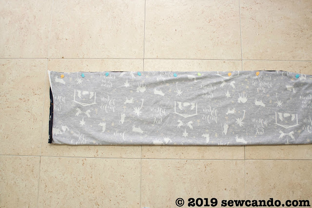 With right sides facing, bring together the long sides and pin all the way across, then stitch with a 3/8 inch seam allowance.