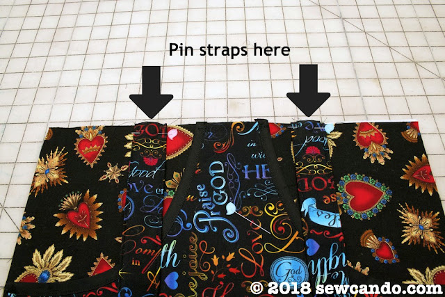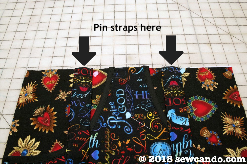 Pin the strap ends to each bag side, 4 inches inward from either side: