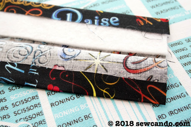 Switch over the work on the straps. Fold the shoulder straps lengthwise and press, then open so there's a crease down the middle:Iron the fusible fleece to one side of the fold:
