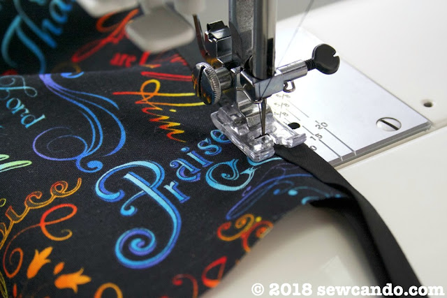 Next, take the pocket panels and attach the double fold bias tape along the pocket curves on each panel: