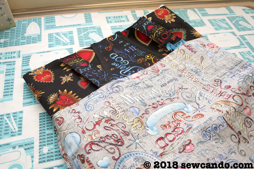 Turn the outer bag right side out and insert it into the lining, pin together around the top edge and stitch: