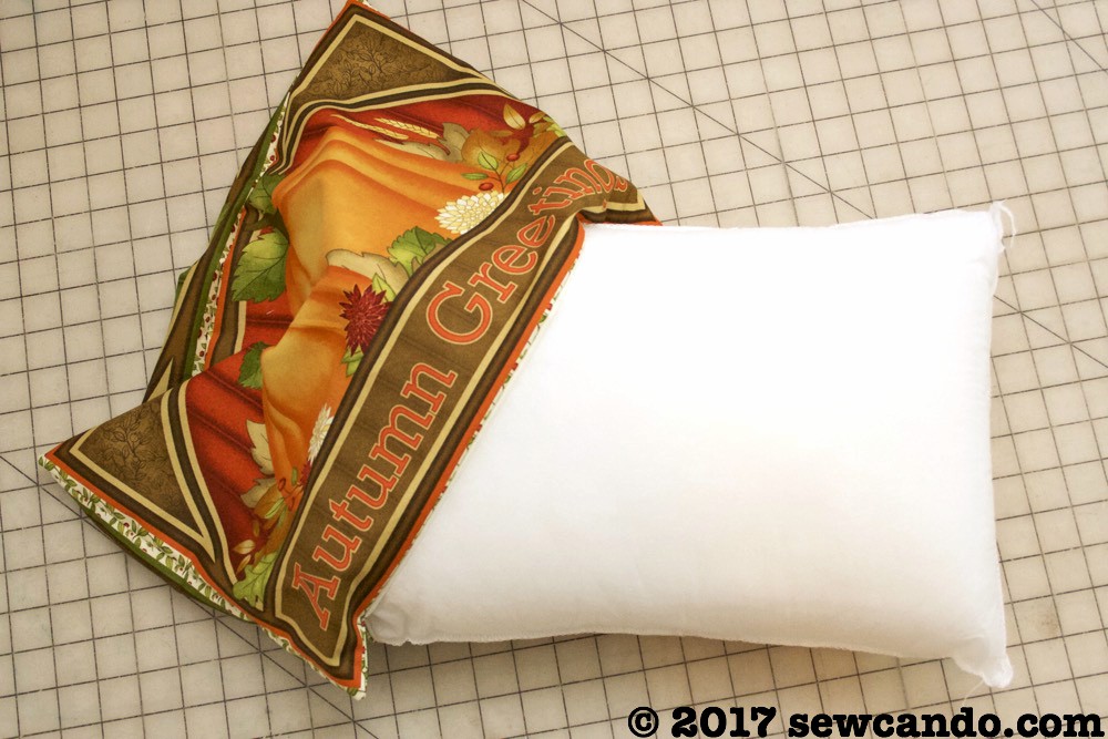 Clip the pointed corners off and then turn the pillowcase right side out and slip the pillow form inside and zip closed. Repeat with remaining panels for the second pillow.