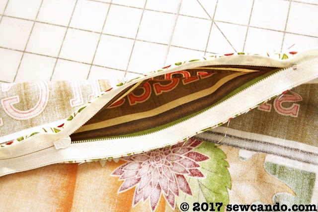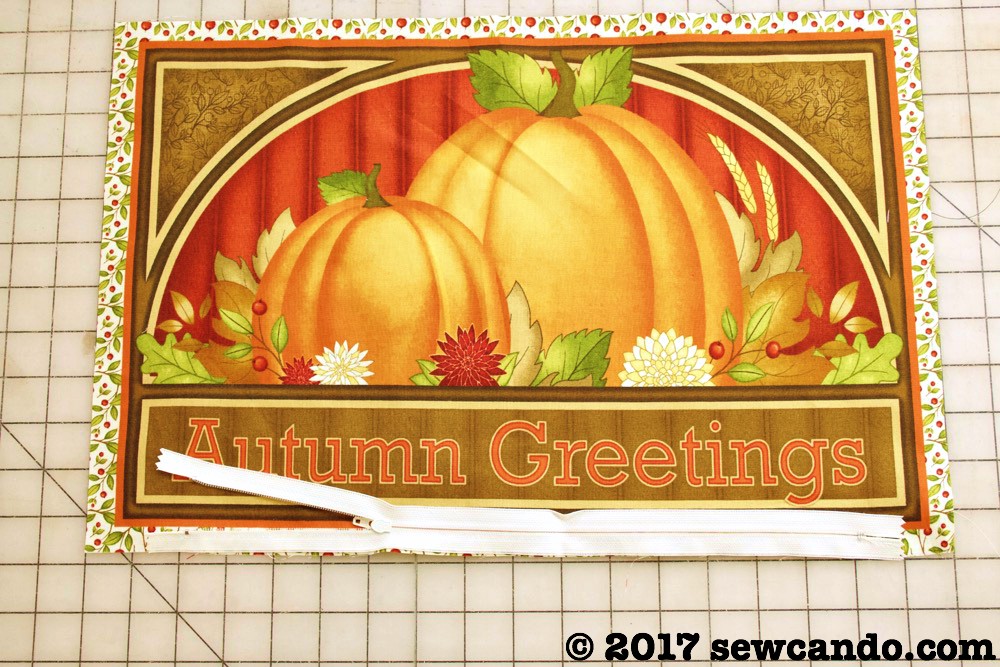 Flip the panel right side up and place another panel face down over it, pinning the bottom edge to the other side of the zipper and then stitching along that side.