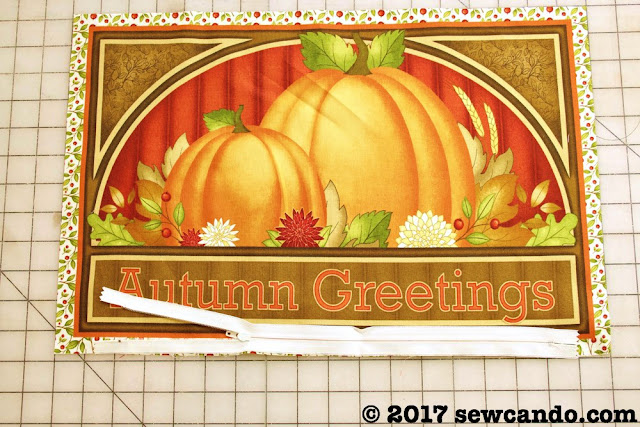 Center the zipper face down along the bottom of a panel, pin and stitch together.