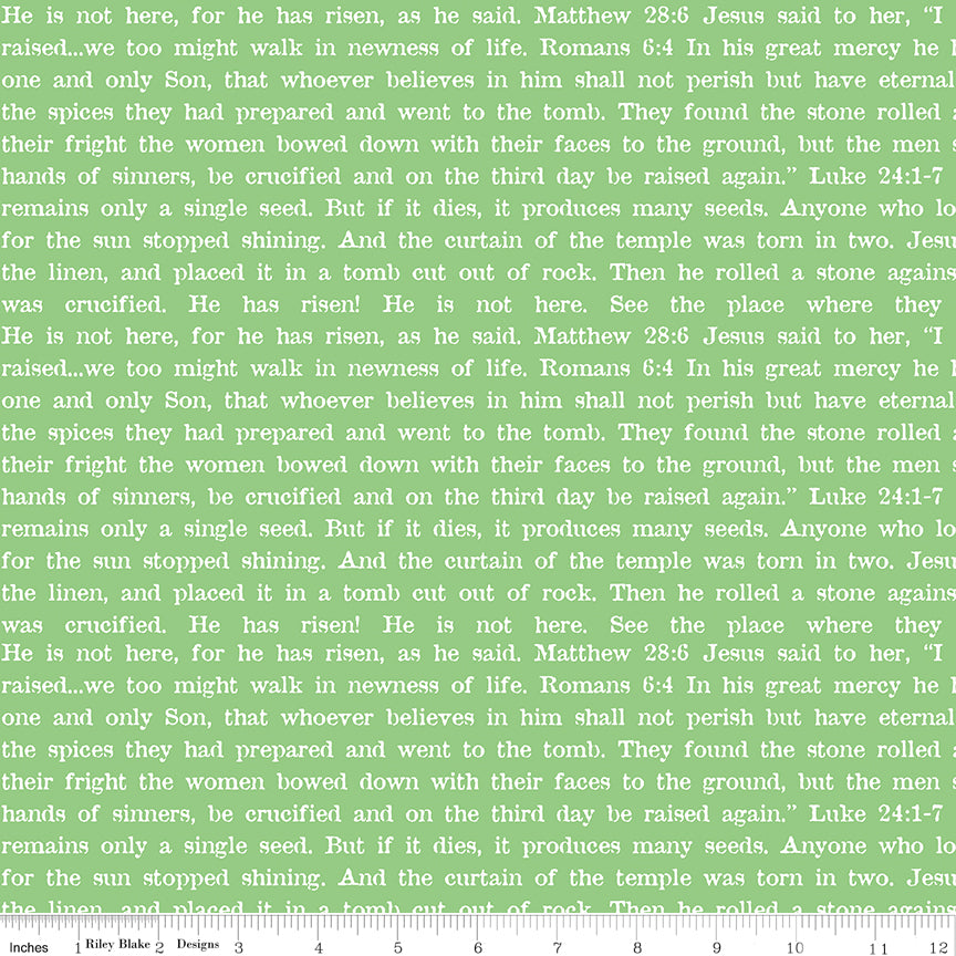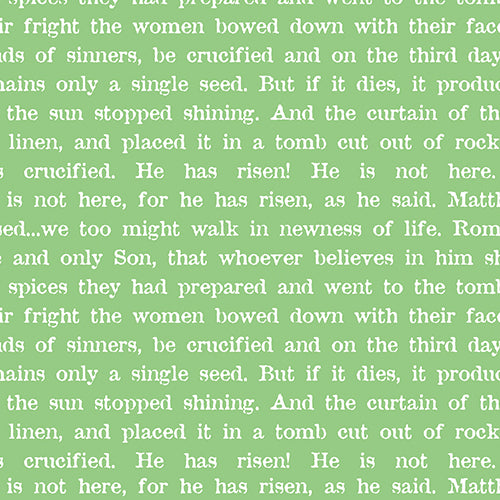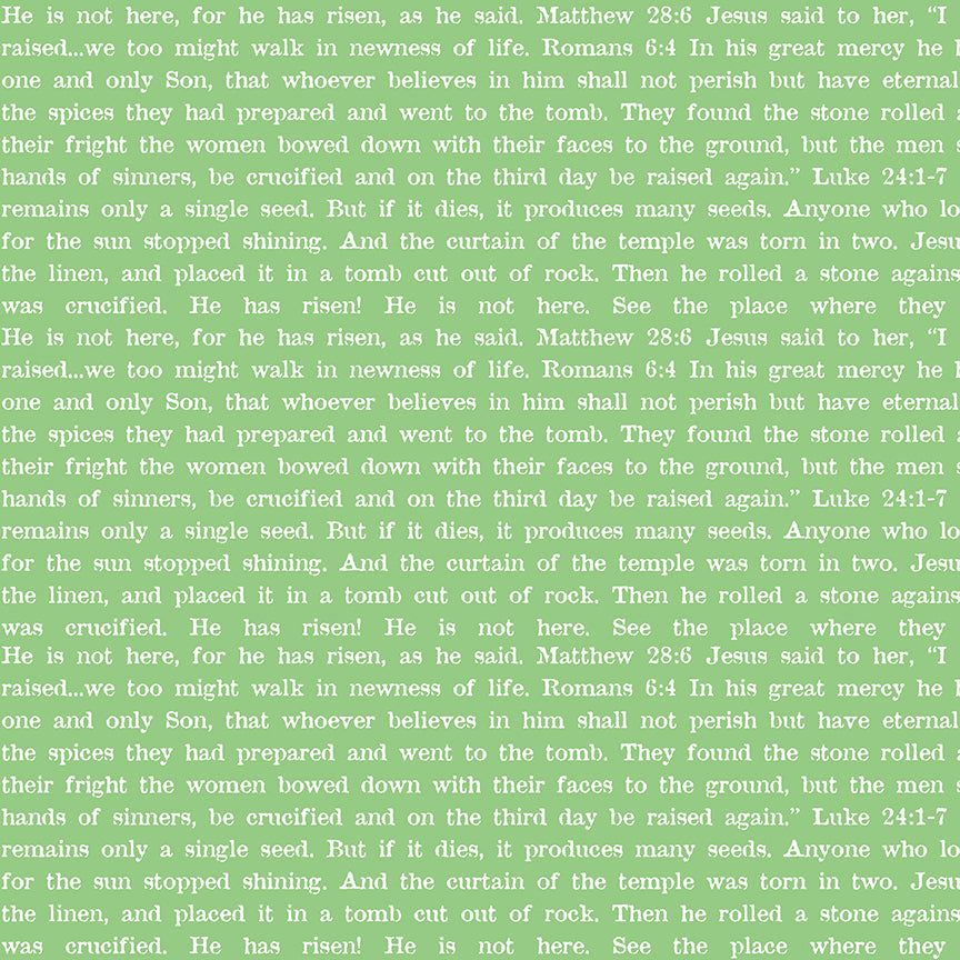 This text print features with Easter-themed Scripture verses like Romans 6:4, Matthew 28:6 and Luke 24:1-7 in white type font on a green background.