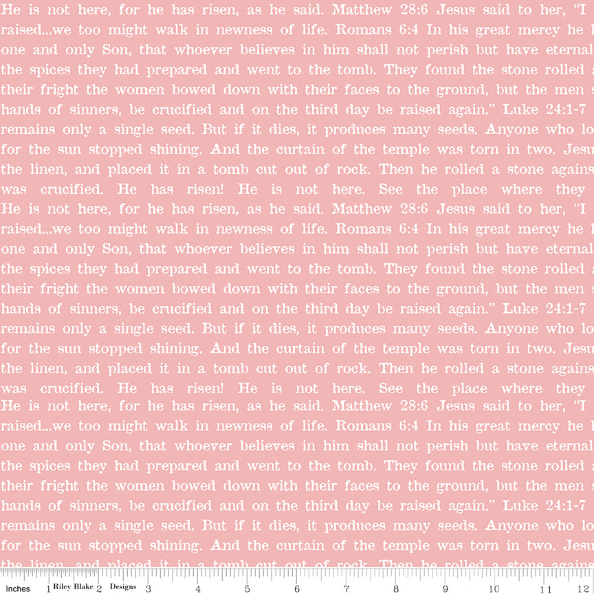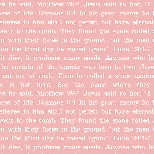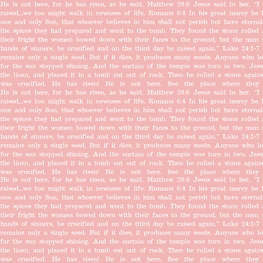 This text print features with Easter-themed Scripture verses like Romans 6:4, Matthew 28:6 and Luke 24:1-7 in white type font on a pink background.