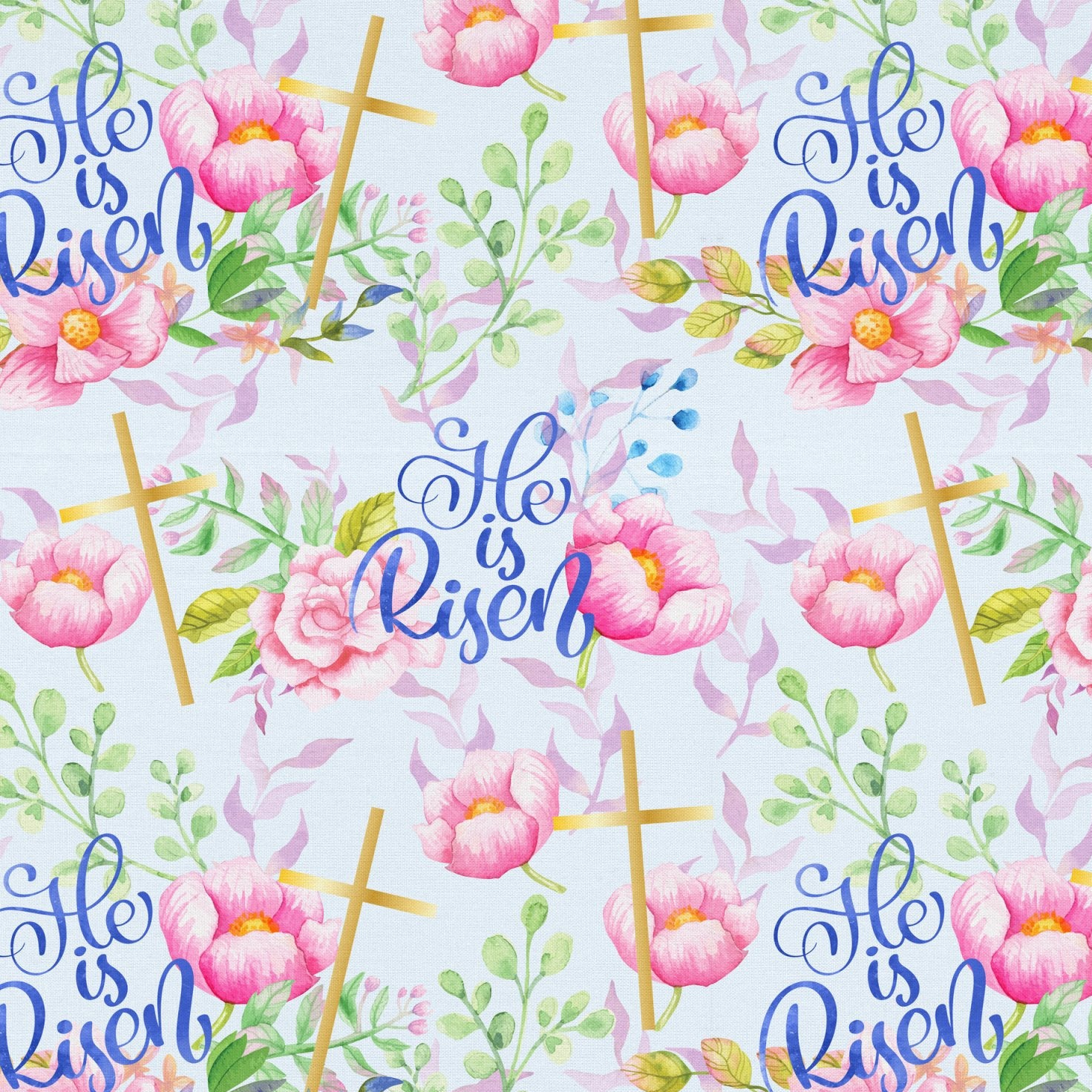 Wonderful watercolor spring design features golden crosses and spring floral blossoms nestled among "He Is Risen" messages on a soft blue background. This fabric features exquisite details that can only be achieved with digital printing!
