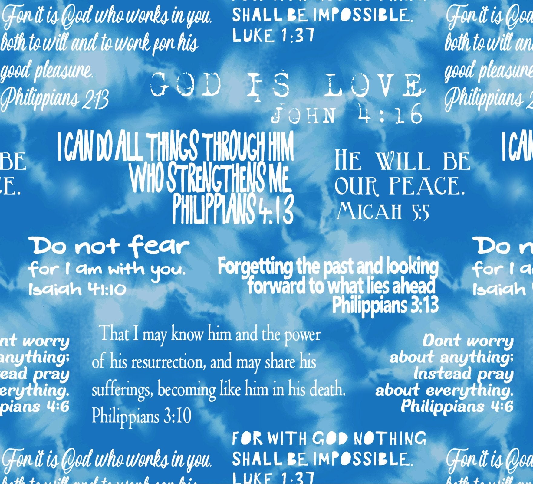 This beautiful and versatile print features many favorite Scripture verses like Isaiah 41:10, Philippians 3:10, 3:13, 4:6, 4:13, Luke 1:37 & John 4:16 on a blue cloud print background.