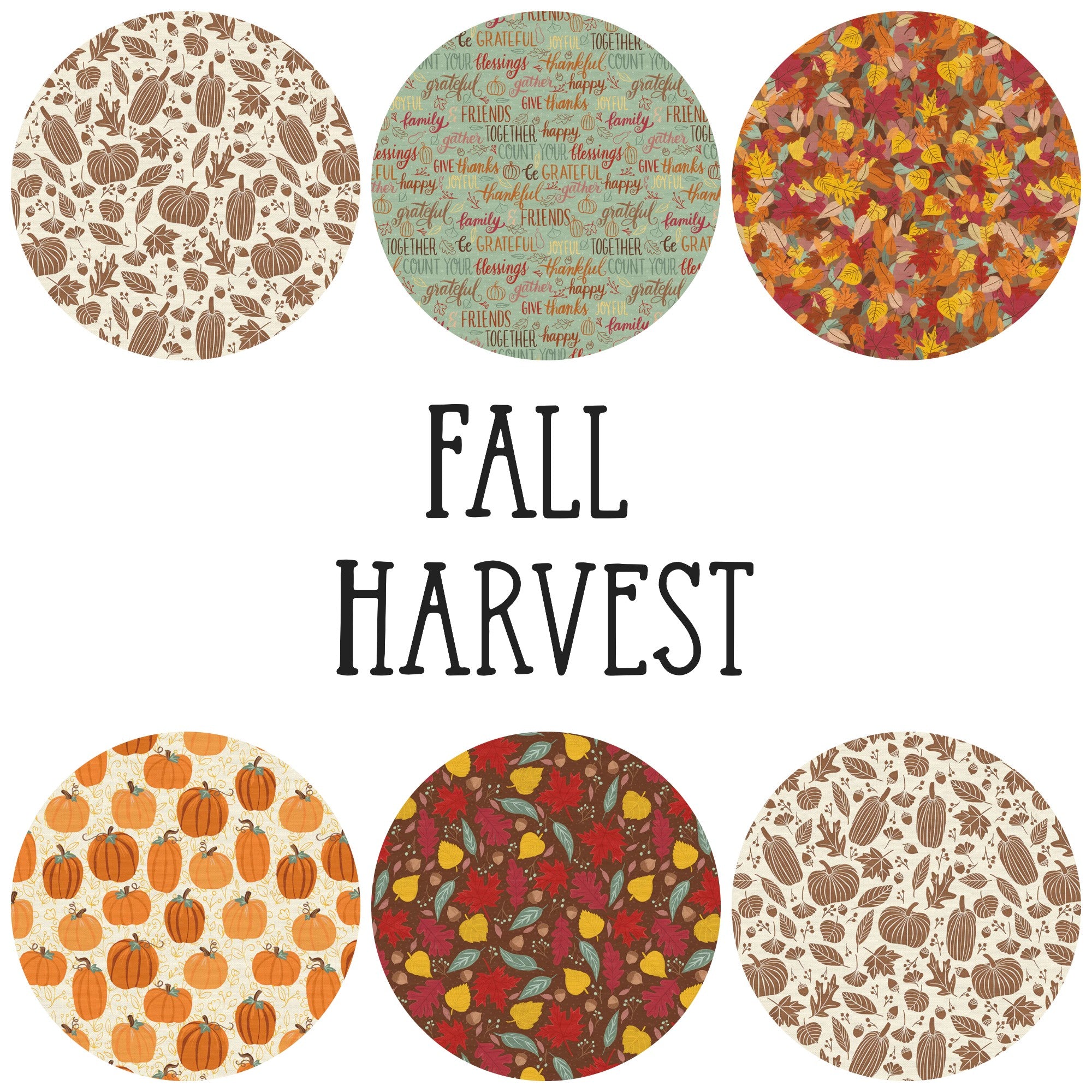 Gather round and give thanks! The Fall Harvest collection captures the joy of gathering with family and friends and expressing gratitude. These prints are perfect for decorative table runners, placemats and quilts to make your home cozy and warm.  It will inspire you to feel thankful, blessed, and ready to gather!  6 coordinating fat quarters on a single continuous piece of fabric to cut as you wish.