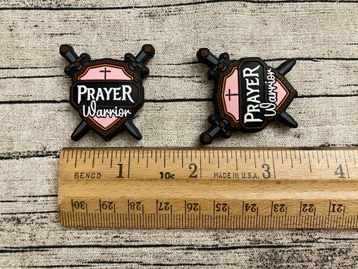 Silicone focal bead featuring unique swords & shield design with "Prayer Warrior" text. Printed on both sides.