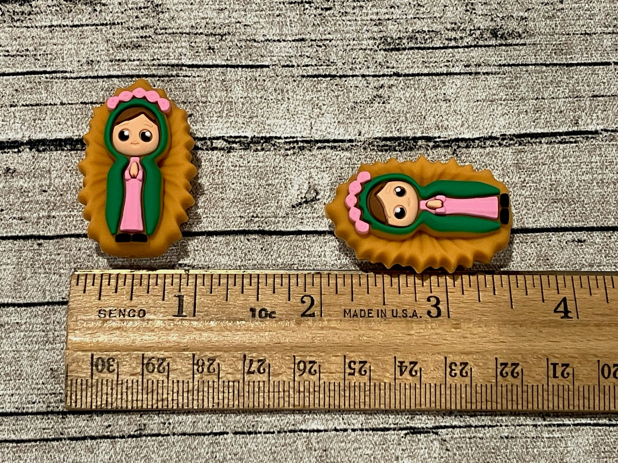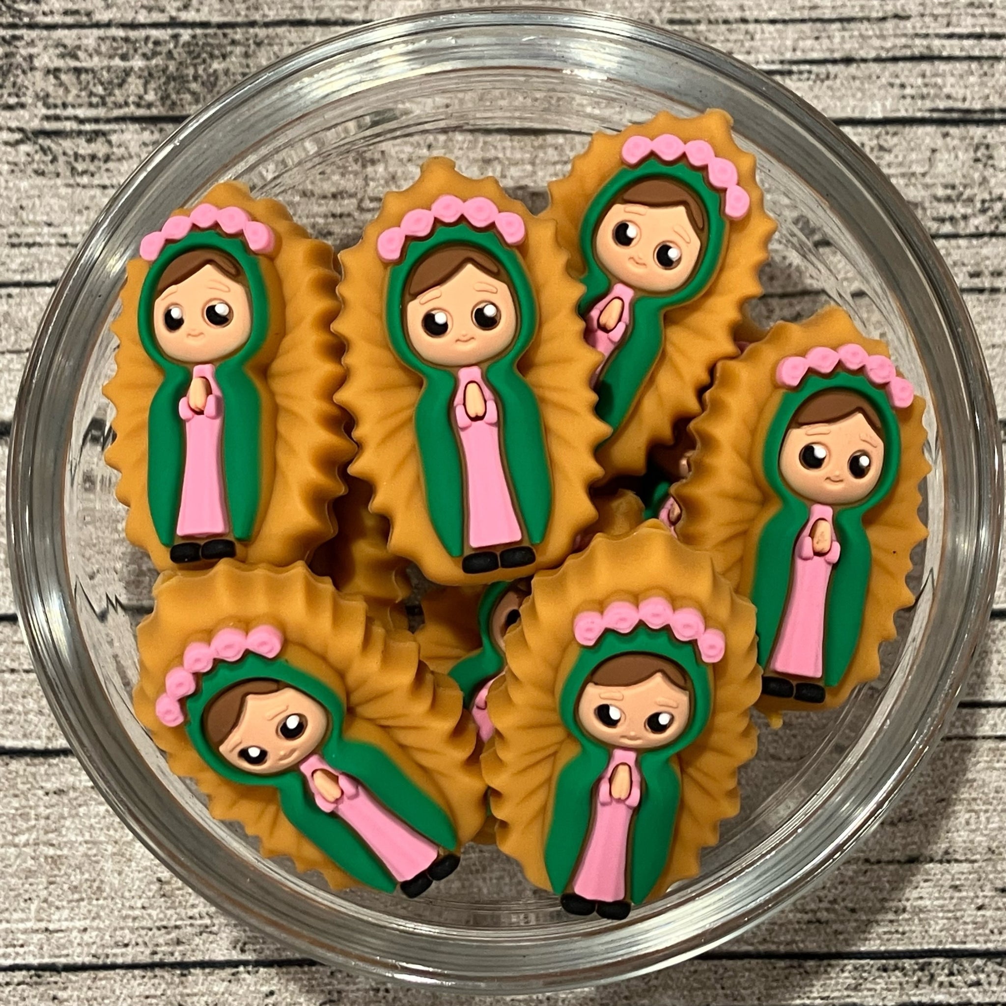 Unique dimensional silicone focal bead of Our Lady of Guadalupe in beautiful vibrant colors.