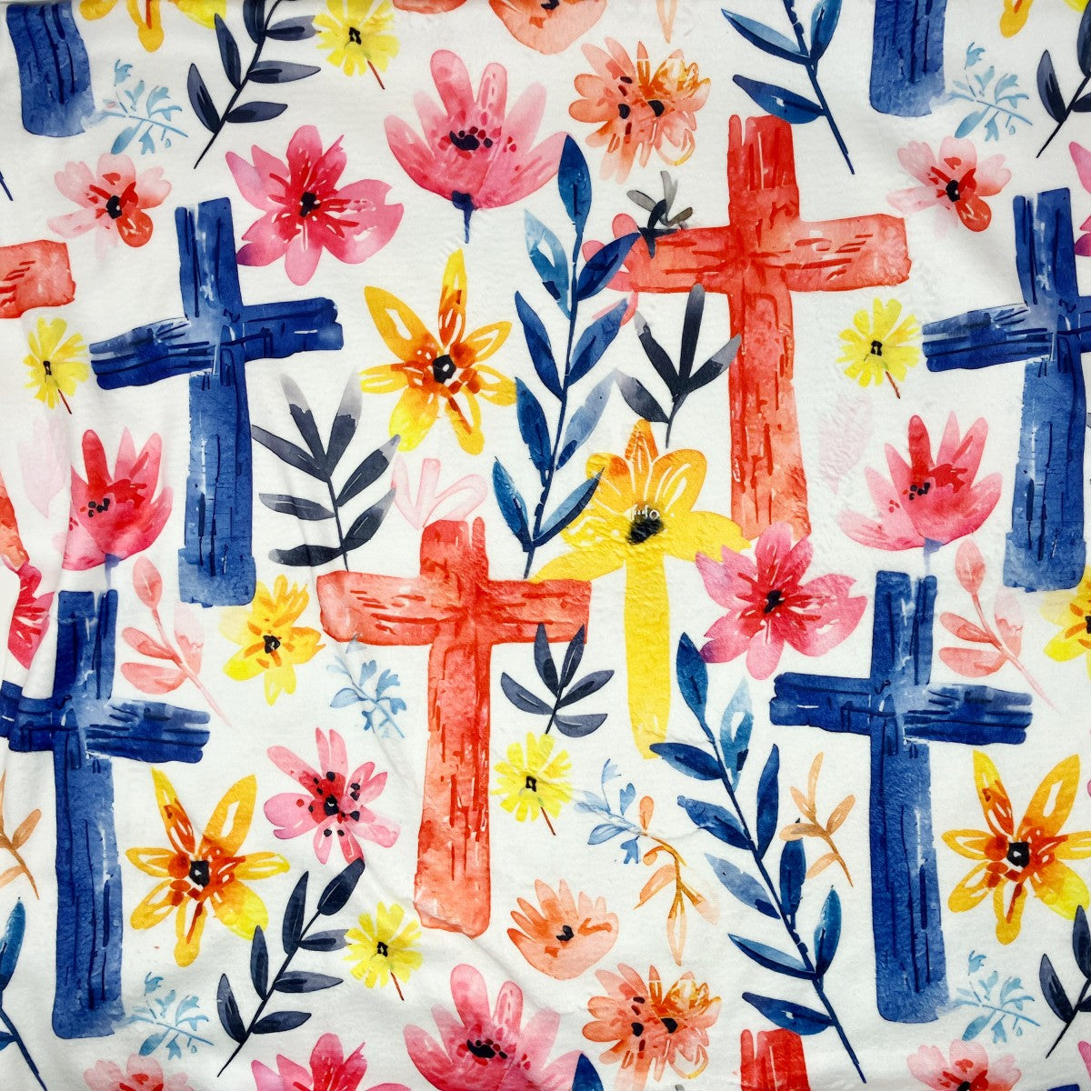 Vibrant watercolor crosses with flowers and leaves in shades of pink, peach, coral, blue and yellow.