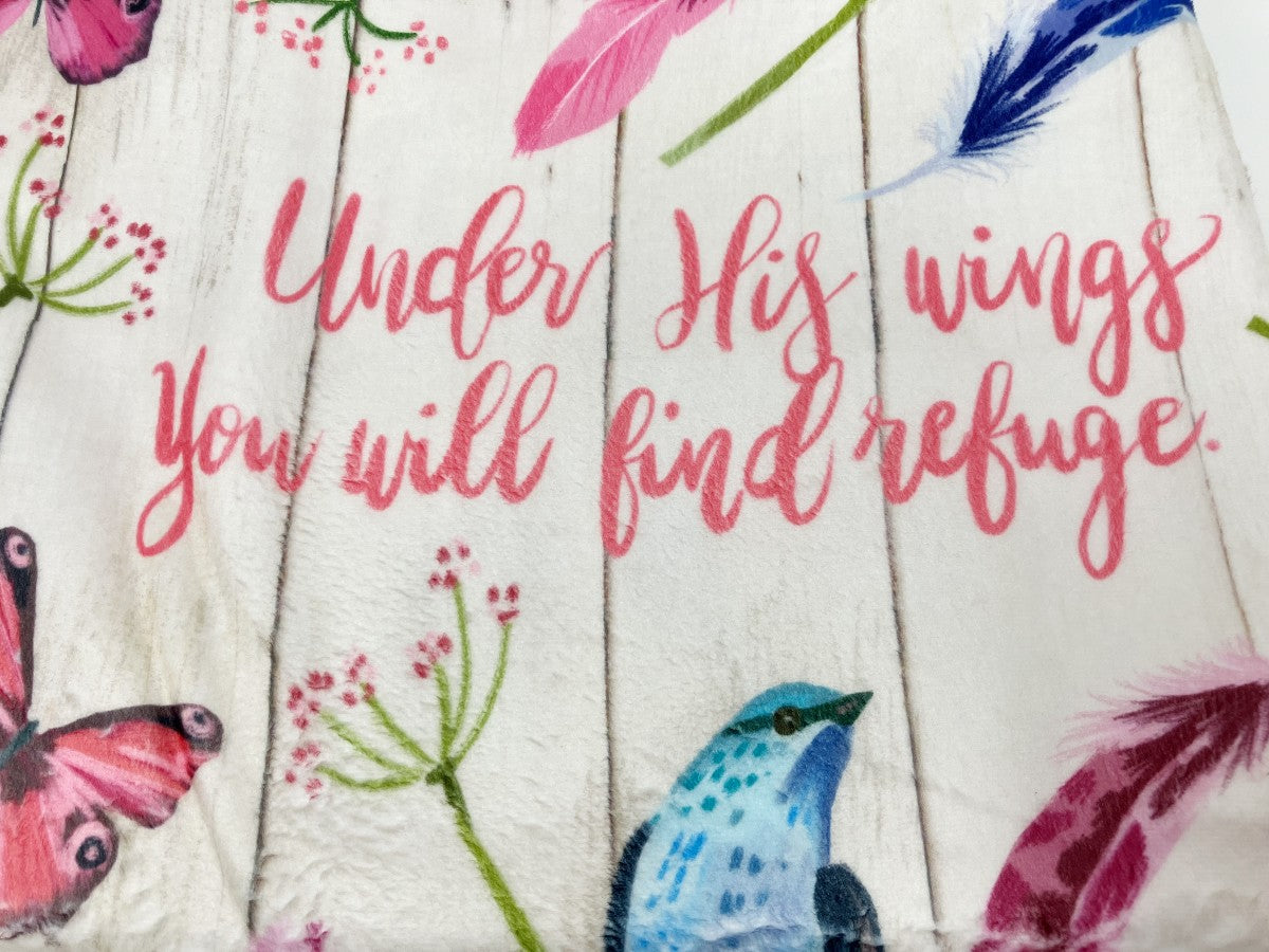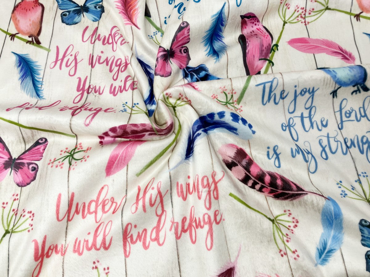 Premium silky fleece fabric print features Scripture text "Under His wings you will find refuge" - Psalm 91:4, "The joy of the Lord is my strength" Nehemiah 8:10. It's digitally printed to provide crisp images on cuddly soft fleece yet cuts just like regular fleece.