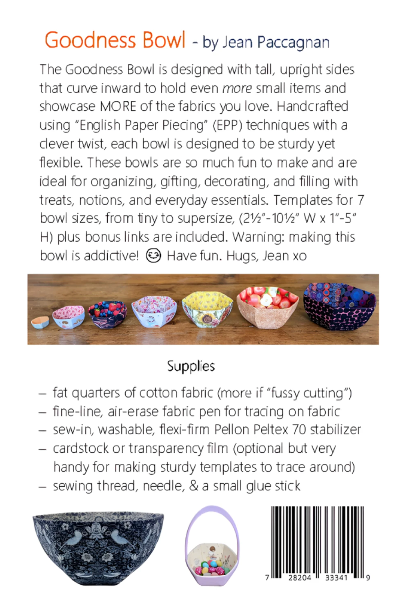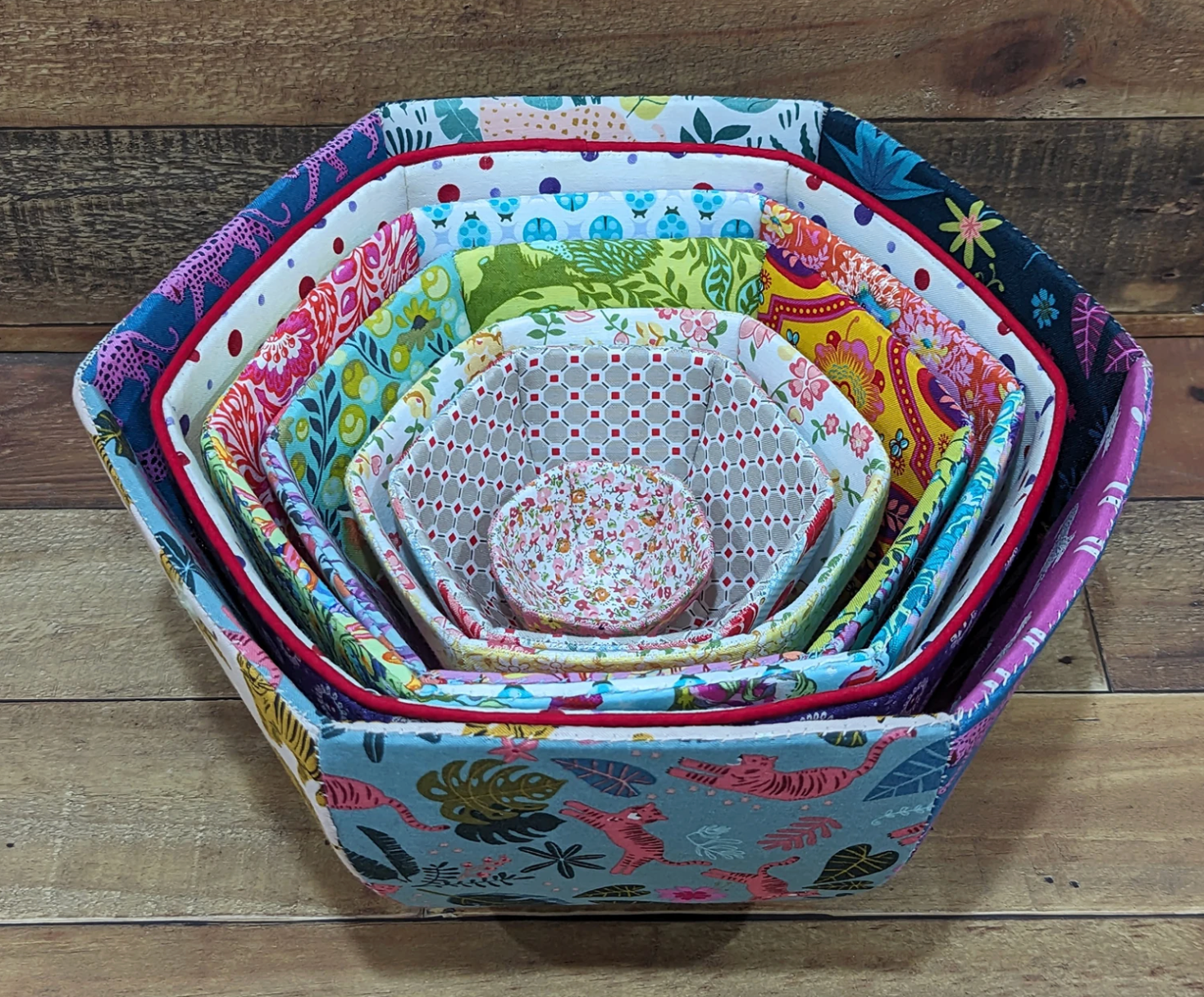 All you need is some fabric, stabilizer, polyester sewing thread, a sewing needle, and scissors!  Bowl is constructed with revised EPP techniques and it goes together relatively quickly.