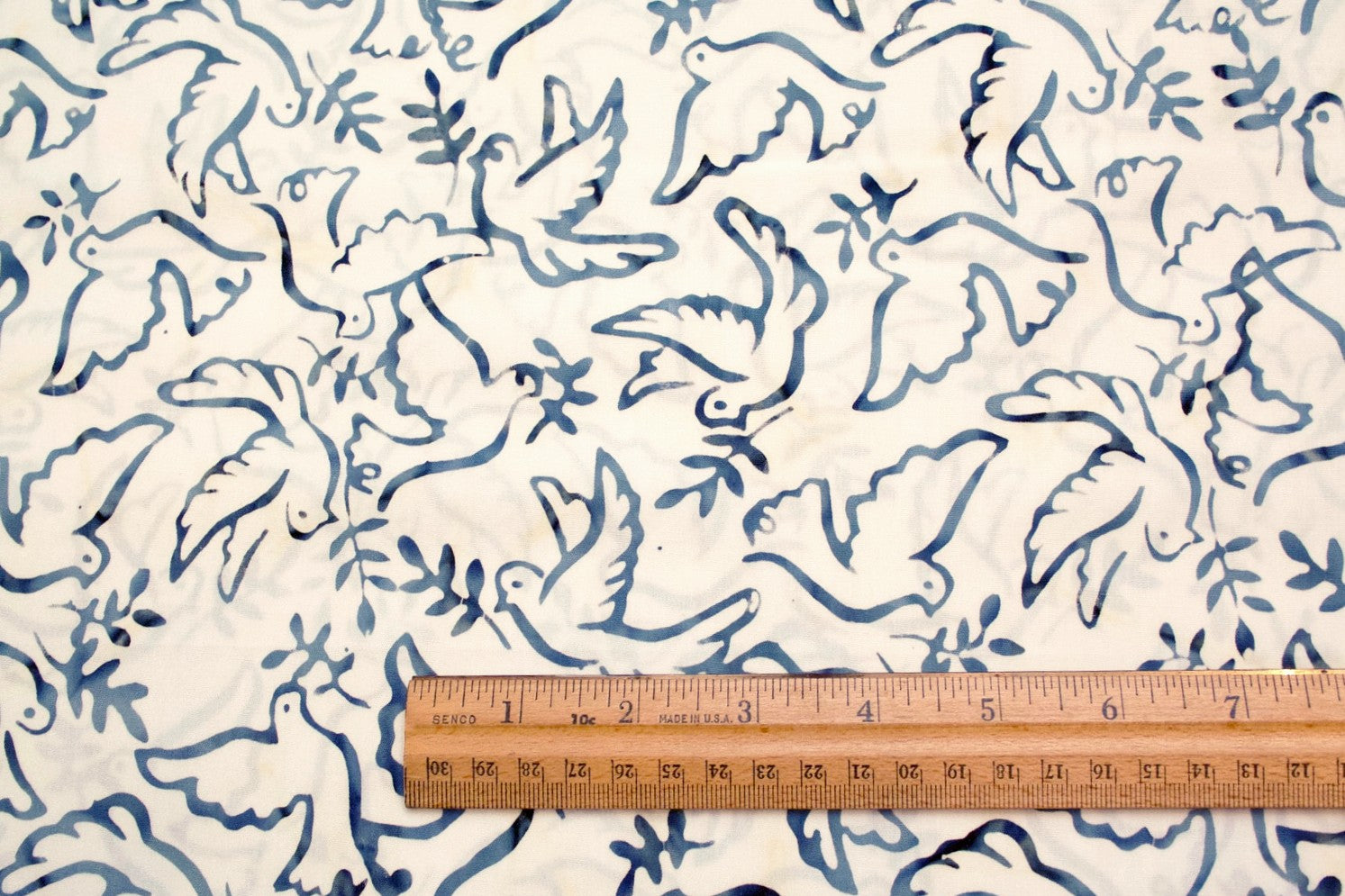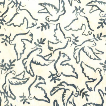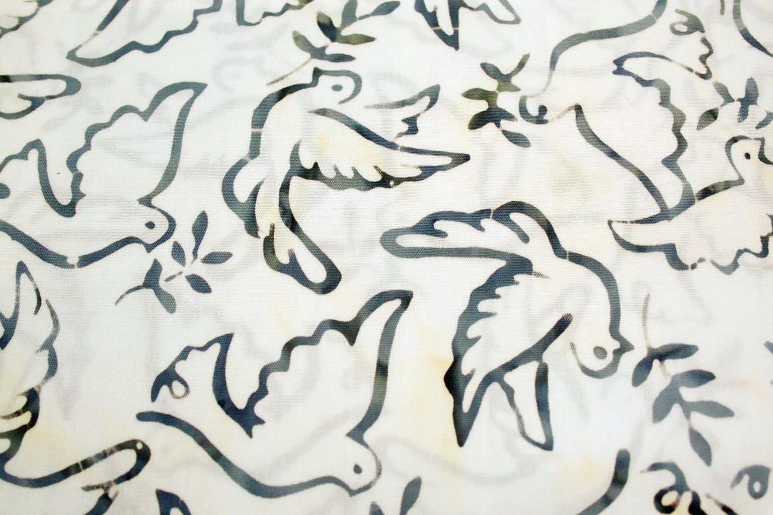 Beautiful hand-dyed batik print, made in Bali, features doves of peace in a dark grey, non-directional design on a warm white background (NOTE: As this is batik, there is creamy-colored pigmentation throughout this fabric that is intentional).