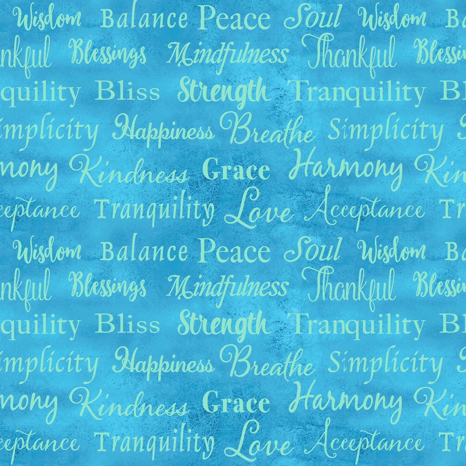 Inspiring script & text words with messages of "Blessings", "Peace", "Thankful", "Kindness" and more in mint green on a multi-hued darker aqua watercolor background.