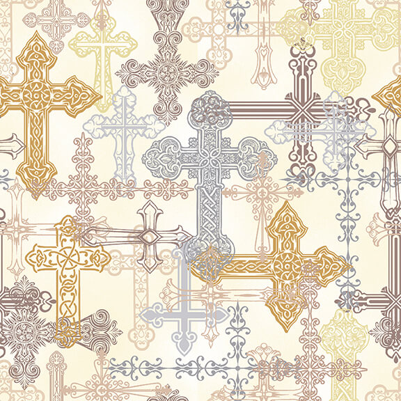 Intricate layered crosses in muted shades of tan, gold, brown and grey on an ivory background.
